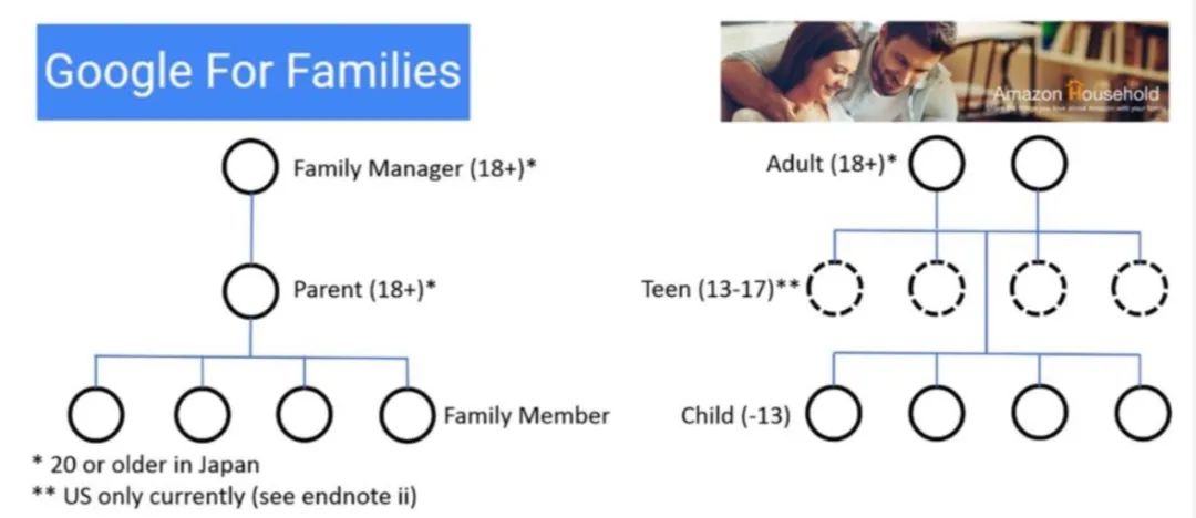 总的来说,亚马逊家庭和谷歌家庭都起到基本的“脚手架”作用。亚马逊将家庭成员按年龄分为三种角色:成人(18 岁及以上),青少年(13-17周岁),儿童(13岁以下)。一个“家庭”中可以容纳十位成员(包括2名成人、4名青少年和4名儿童)。相较而言,谷歌“家庭”只可容纳6个成员,家庭成员角色包括一名家庭经理、一名家长和其他四个家庭成员。这两组“家庭”的共性在于,不同的家庭角色具有不同的功能支持,但整体上都呈现出层级式的特征(见下图)。