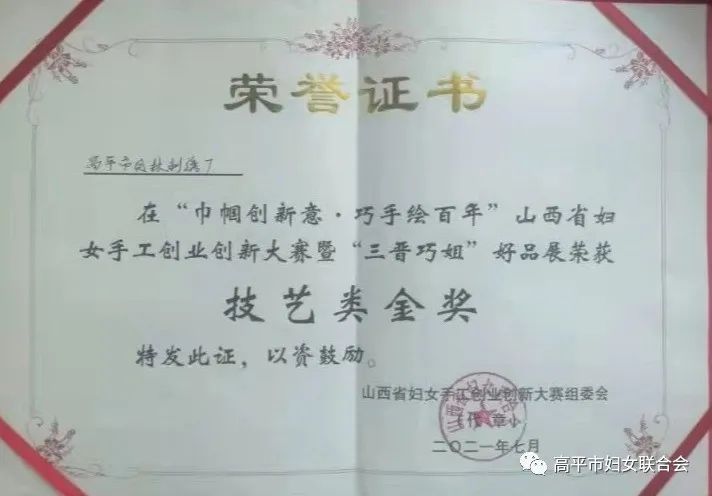 7月27日,由山西省妇联、省工信厅、省文旅厅、省乡村振兴局联合举办的“巾帼创新意·巧手绘百年”山西省妇女手工创业创新大赛暨“三晋巧姐”好品展,在古都大同举办。由高平市妇联推选的凤林刺绣厂脱颖而出,成功斩获技艺类金奖。