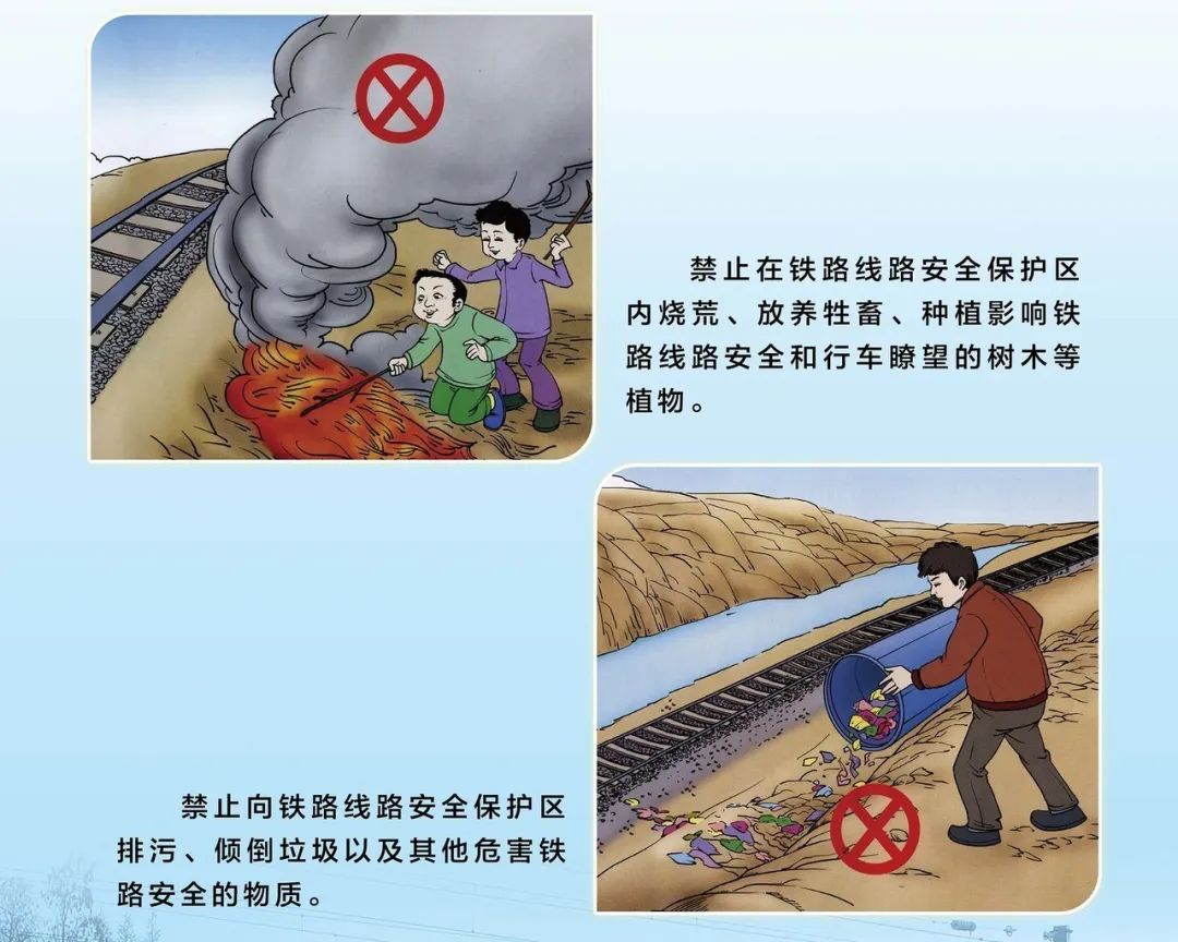 禁止在铁路线路安全保护区内烧荒、放养牲畜、种植影响铁路线路安全和行车瞭望的树木等植物。禁止向铁路线路安全保护区排污、倾倒垃圾以及其他危害铁路安全的物质。