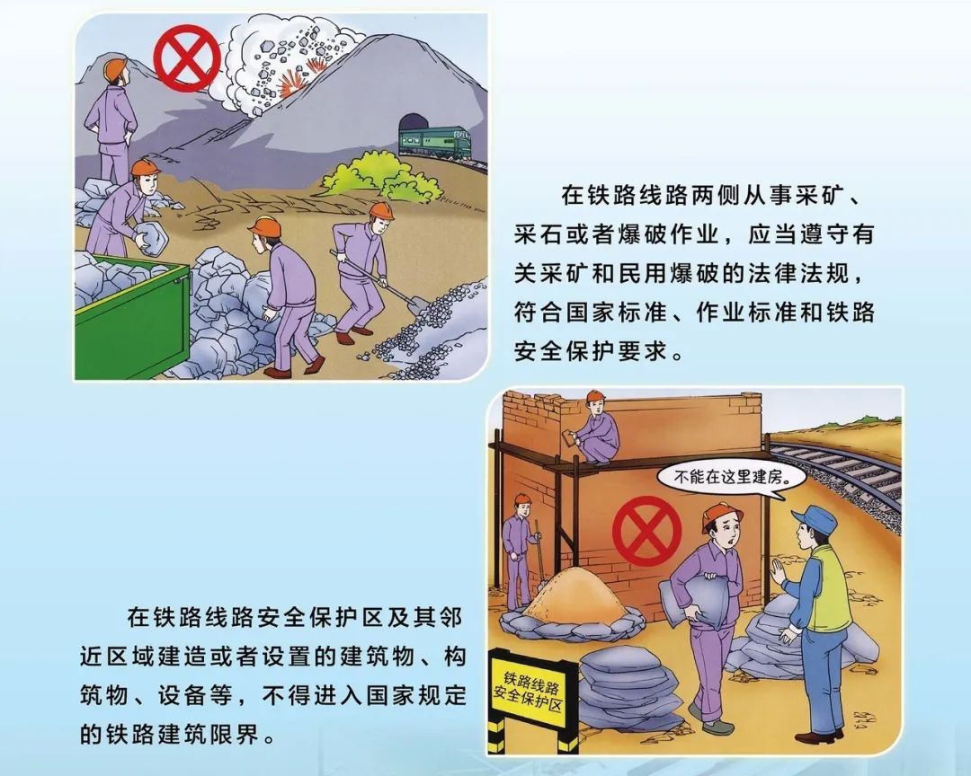 在铁路线路两侧从事采矿、采石或者爆破作业,应当遵守有关采矿和民用爆破的法律法规,符合国家标准、行业标准和铁路安全保护要求。