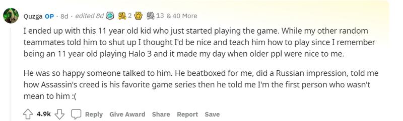 “我在随机匹配的时候遇到了这个11岁的孩子,”视频发布者,同时也是楼主的Quzga解释道,“他接触这个游戏时间不久,其他路人队友在听到他的声音之后就大嚷着让他‘闭嘴’。我觉得对一个初来乍到的孩子要温柔一点对待,就手把手地教他怎么玩。这让我想起当初11岁玩《光环3》的时候,那时愿意帮我的好人也有很多,这也算一种回报吧。”