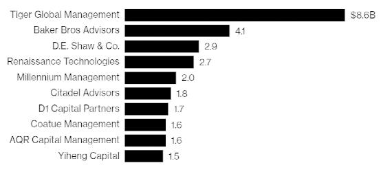 截至 3 月 31 日,Tiger Global 持有中国公司 86 亿美元的美国存托凭证,位居 340 家公开披露此类资产的对冲基金之首。申报文件显示,这些美国存托凭证最新的估值约为 64 亿美元。披露的信息不包括空头头寸和非美国交易证券。