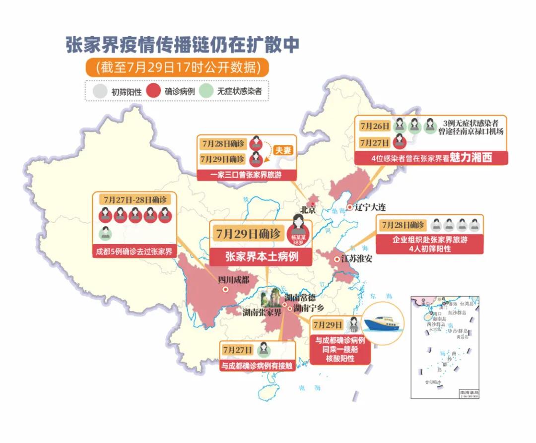 目前由南京新冠病例外溢到张家界引发的新传播链已经形成。7月29日湖南机场集团要求,张家界机场、常德机场、怀化机场的员工及家属禁止外出或前往社会公共区域。张家界市宣布自7月30日起关闭所有景区景点。