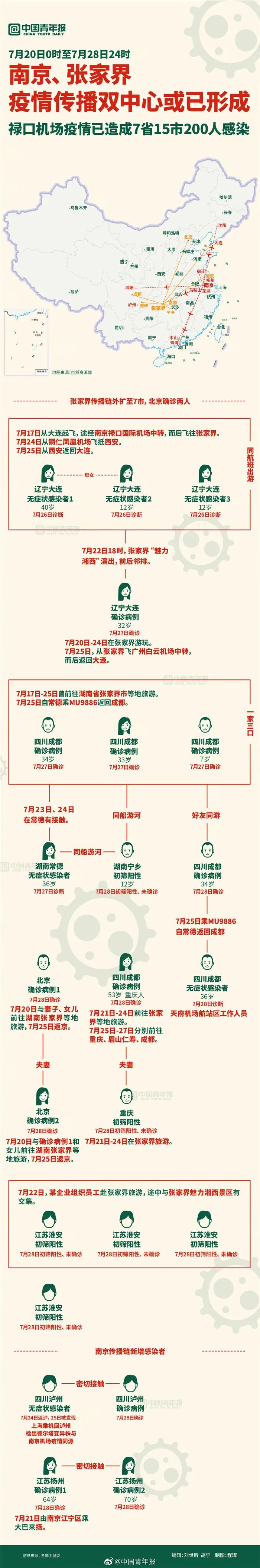 7月20日0时至28日24时,南京禄口机场相关疫情已造成全国7省15市200人感染,其中南京本地感染者173例。南京传播链昨日增扩到扬州。同时,由南京病例外溢到张家界引发的新传播链,目前以张家界为中心,外扩至包括北京、成都在内的7市。