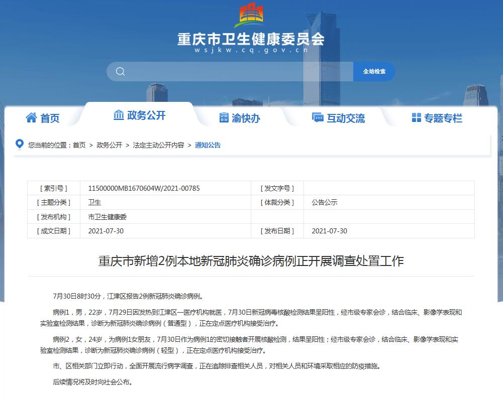 据重庆市卫健委网站消息,7月30日8时30分,重庆市江津区报告2例新冠肺炎确诊病例。