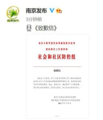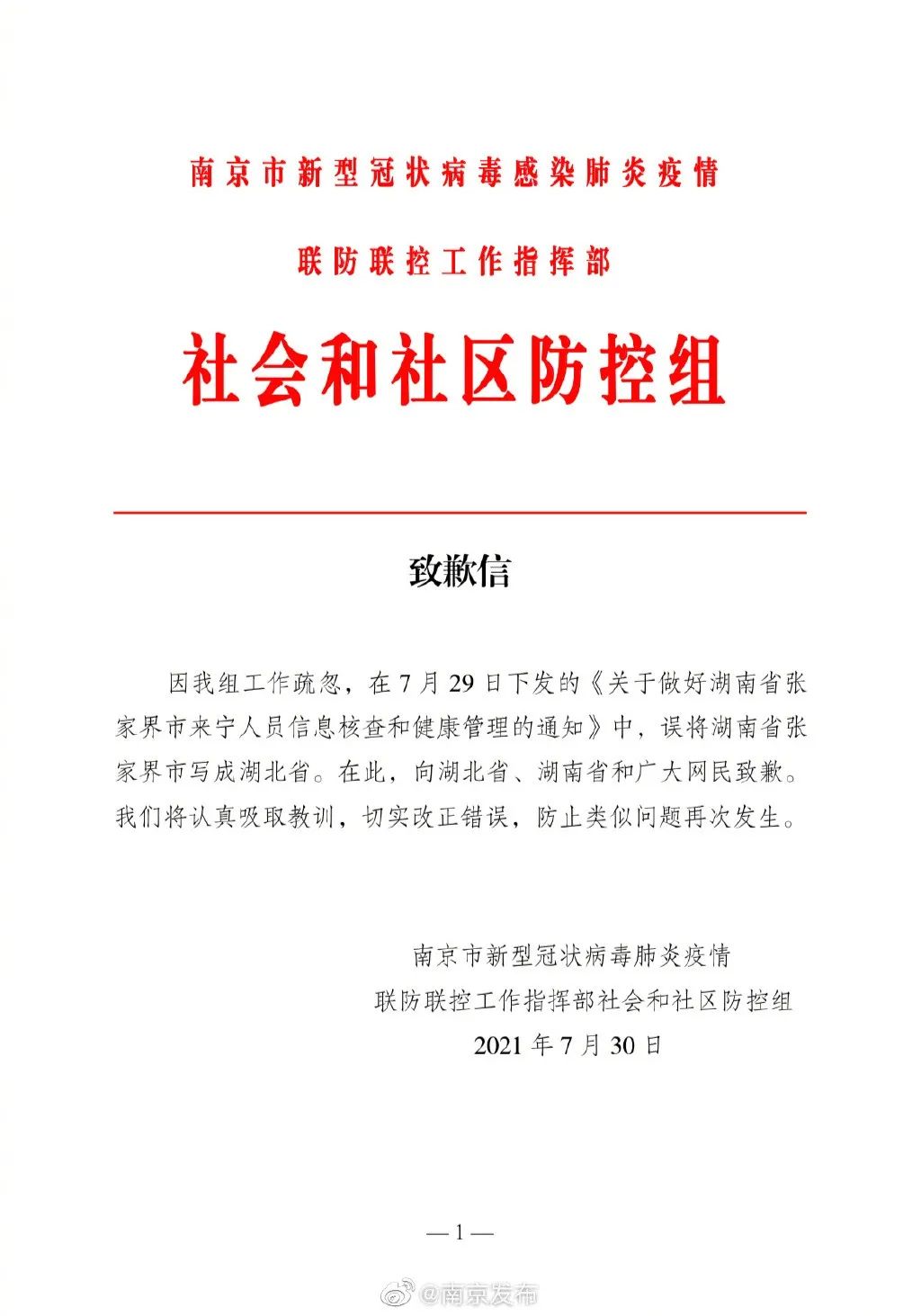 7月30日,@南京发布发布微博称,因我组工作疏忽,在7月29日下发的《关于做好湖南省张家界市来宁人员信息核查和健康管理的通知》中,误将湖南省张家界市写成湖北省。在此,向湖北省、湖南省和广大网民致歉。我们将认真吸取教训,切实改正错误,防止类似问题再次发生。
