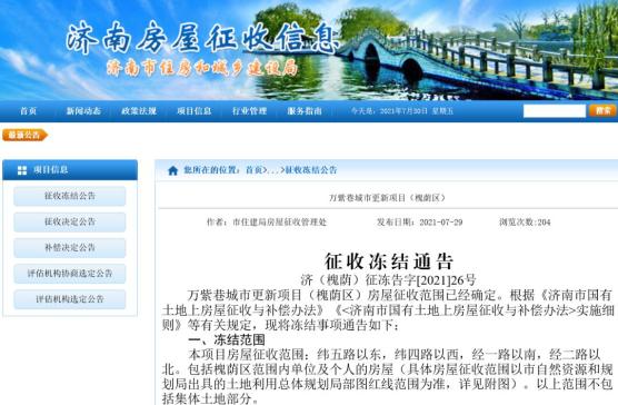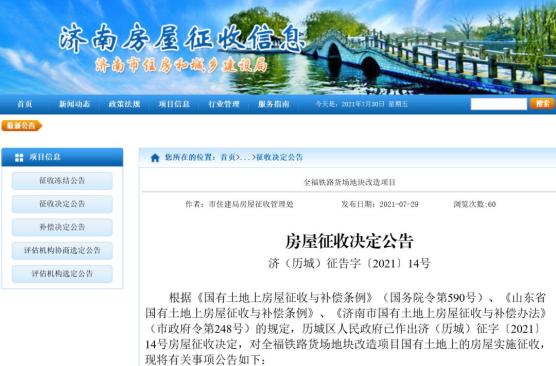 7月29日,历城区发布全福铁路货场地块改造项目房屋征收决定公告,对全福铁路货场地块改造项目国有土地上的房屋实施征收。根据项目补偿方案,征收补偿签约期限为30日。