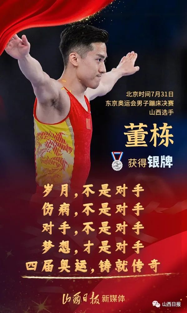 蹦床传奇,热血铸就!北京时间7月31日,2020东京奥运会男子蹦床项目决赛结束,奥运“四朝元老”、山西选手董栋以微弱劣势惜败白俄罗斯选手伊万,获得一枚宝贵的银牌。4届奥运会,9平方米的天地,1金2银1铜,董栋无愧青春,无愧梦想。