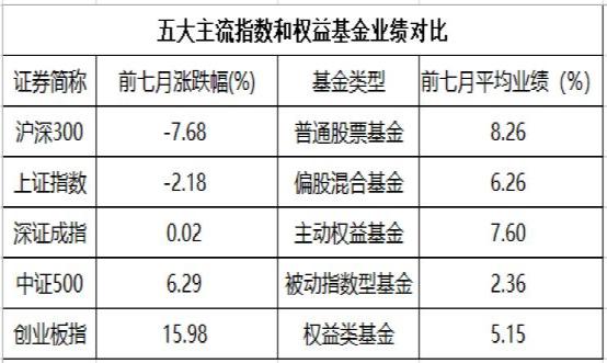 在这样的市场行情下,布局A股的权益基金中超8成产品前7月获得正收益。主动权益基金平均收益率为7.6%,大幅领先同期沪深300、上证指数以及深证成指表现,同时回报率也好于中证500指数。