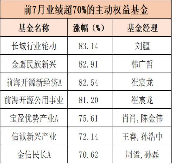 随着7月底的到来,前7个月基金业绩新鲜出炉。期间主动权益基金整体表现优于多个主流指数,逾7成主动权益基金斩获正收益。其中41只基金赚超50%,重仓新能源、半导体的产品依然强势。