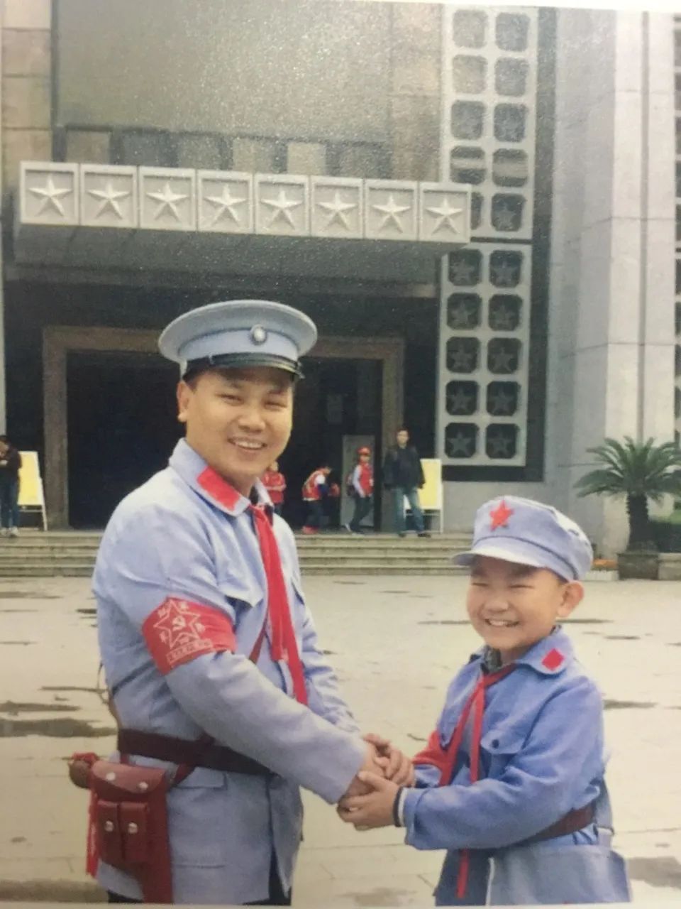 王家明:我和我儿子一起在八一起义纪念馆参观,重演红军井冈山胜利会师的场景。