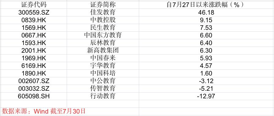 A股上市的佳发教育表示,公司的主营业务为研发、生产、销售、实施具有自主知识产权和自主品牌的教育信息化产品并为用户提供相关服务,主要面向国家教育主管部门、考试机关及学校。不属于““双减“”政策调控的 K12 学科类校外培训机构,政策对公司主营业务不存在重大不利影响。在市场情绪逐步缓解后,该股从7月26日的低点反弹,反弹幅度达到46.18%。