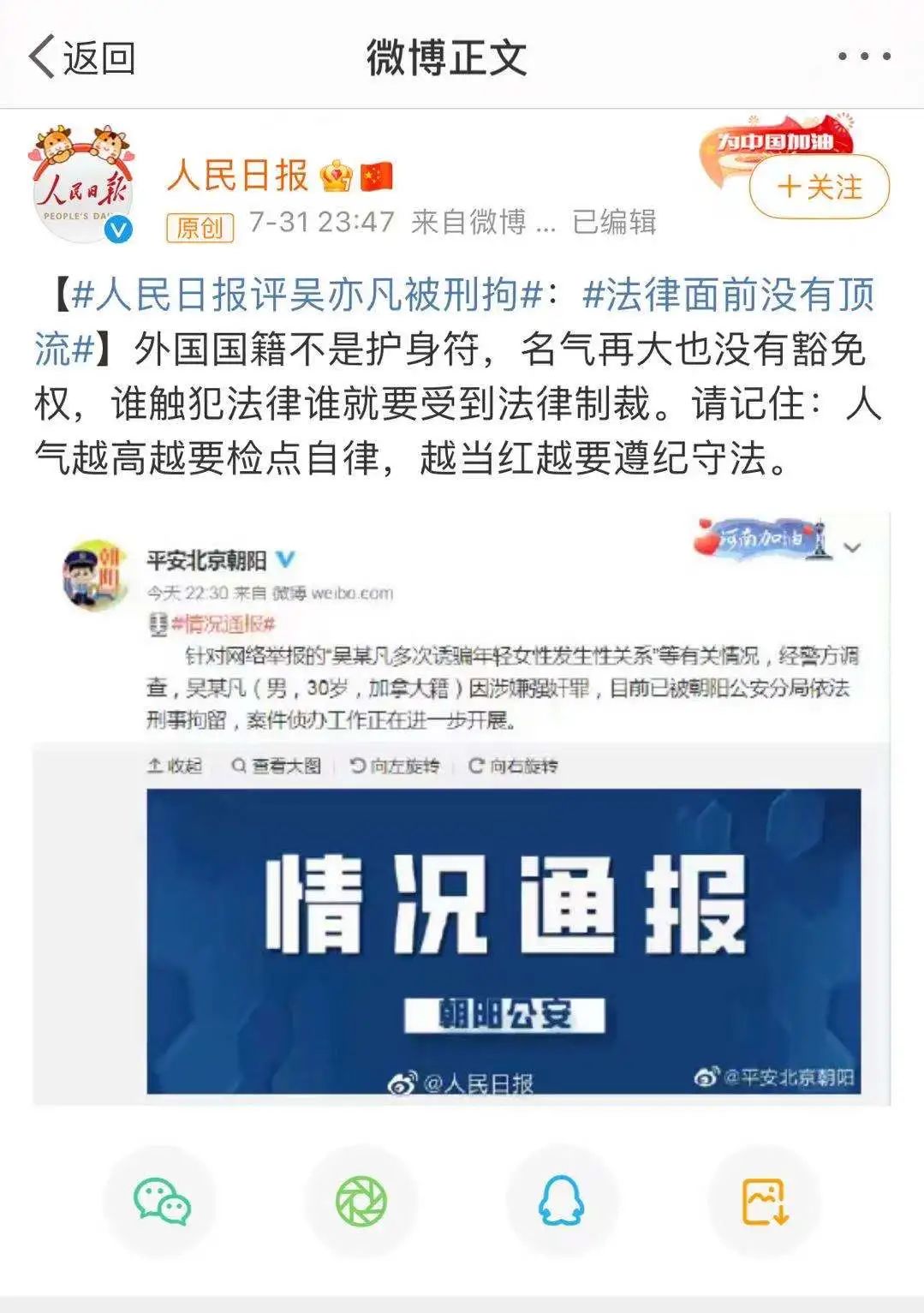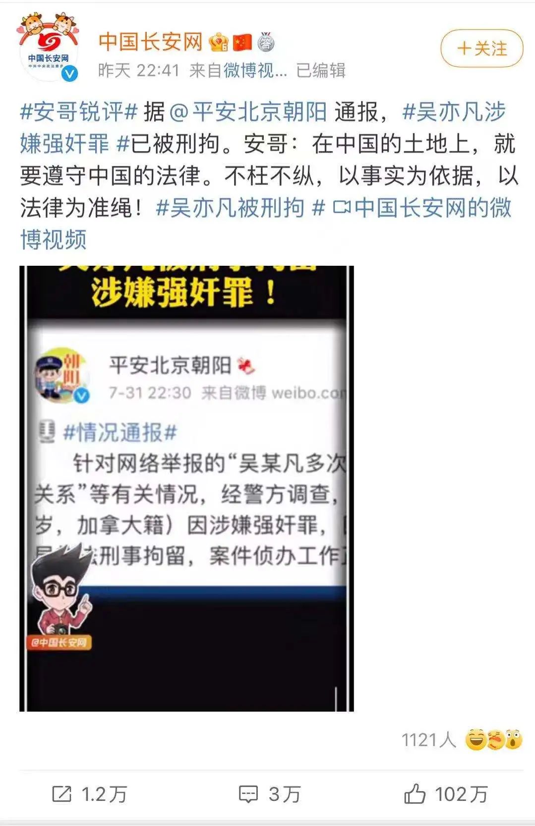 此前,7月31日,针对网络举报的“吴某凡多次诱骗年轻女性发生性关系”等有关情况,经警方调查,吴某凡(男,30岁,加拿大籍)因涉嫌强奸罪,目前已被朝阳公安分局依法刑事拘留,案件侦办工作正在进一步开展。