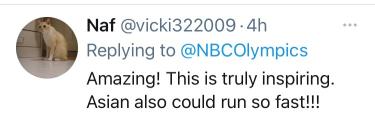 在苏炳添半决赛以9秒83的成绩进入决赛后,美国全国广播公司(NBC)的奥运报道账号在推特上感叹:“多棒的收尾!苏炳添跑出9.83秒的成绩赢得男子100米半决赛。”↓