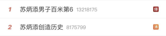 微博网友的祝贺与称赞如潮水般涌来。很快,“苏炳添男子百米第6”“苏炳添创造历史”也迅速登上微博热搜。