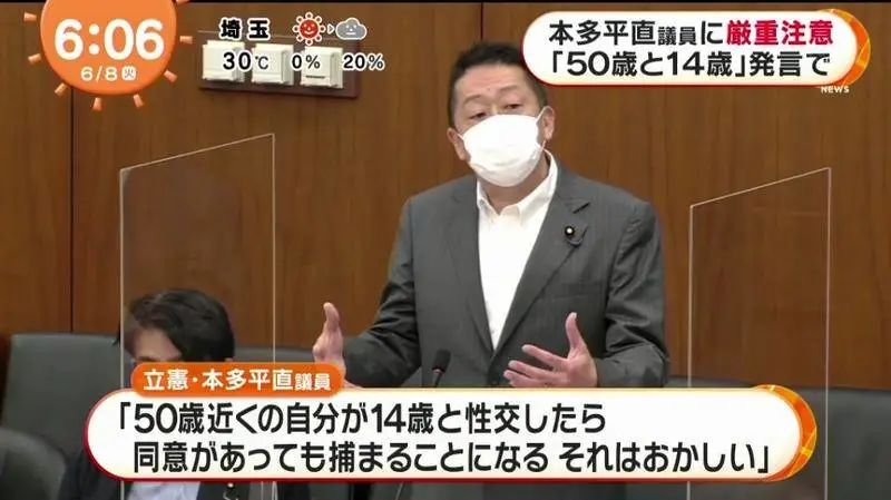 ▲ 关于“同意性交”作出争议发言的立宪民主党众议院议员本多平直。图片:tv-asahi