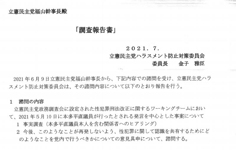 立宪民主党骚扰防止委员会将这一事件进行整理,公示了一部关于本多“同意性交”发言的调查报告书。报告书显示,2021年4月起,就是否将日本刑法第177条中“同意性交的最低年龄”从13岁提升至16岁的修正方案,立宪民主党政务调查会上成立的“关于性犯罪刑法改正的工作组”进行了多次讨论。
