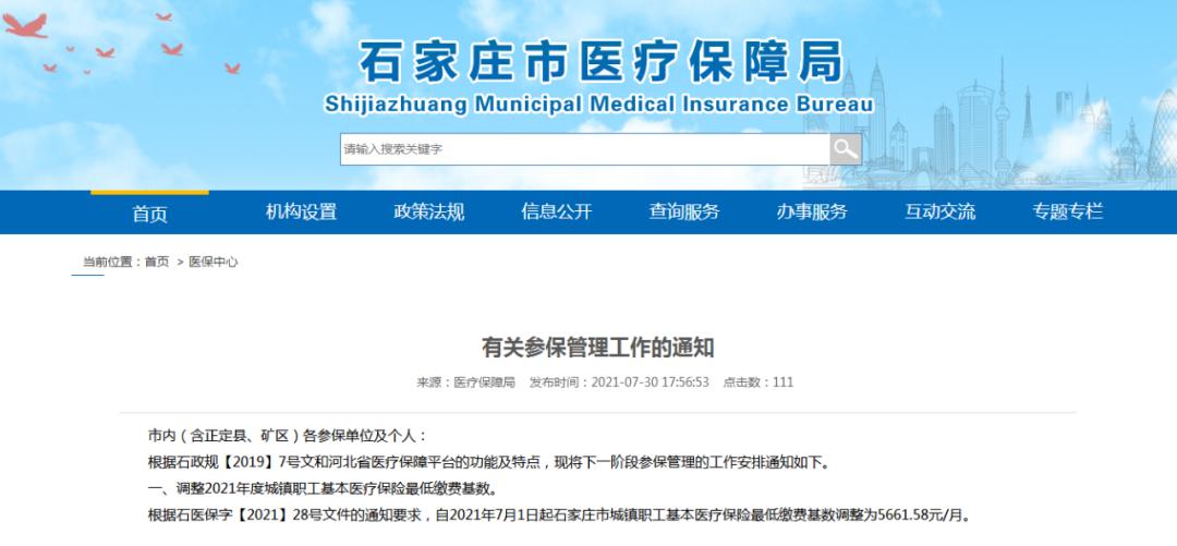 根据石医保字【2021】28号文件的通知要求,自2021年7月1日起石家庄市城镇职工基本医疗保险最低缴费基数调整为5661.58元/月。