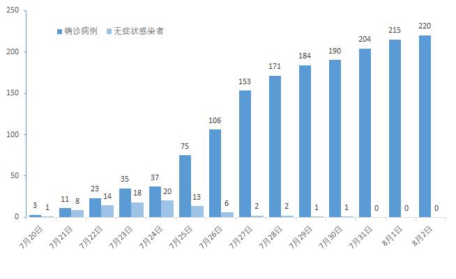 截止8月2日24时,南京本地报告共报告220确诊病例,无症状感染者0例。