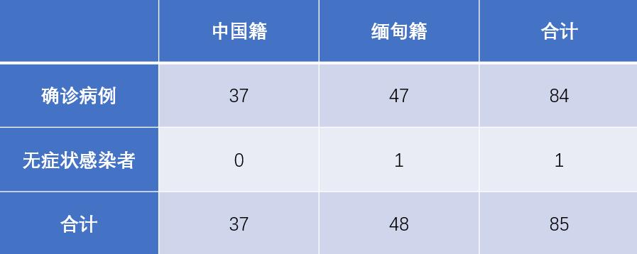 云南自7月4日报告本土确诊病例以来,截止8月2日24时,累计报告确诊病例94例(中国籍44例,缅甸籍50例),无症状感染者2例(均为缅甸籍)。其中,瑞丽市共报告确诊病例84例,无症状感染者1例,陇川县报告确诊病例10例,无症状感染者1例。