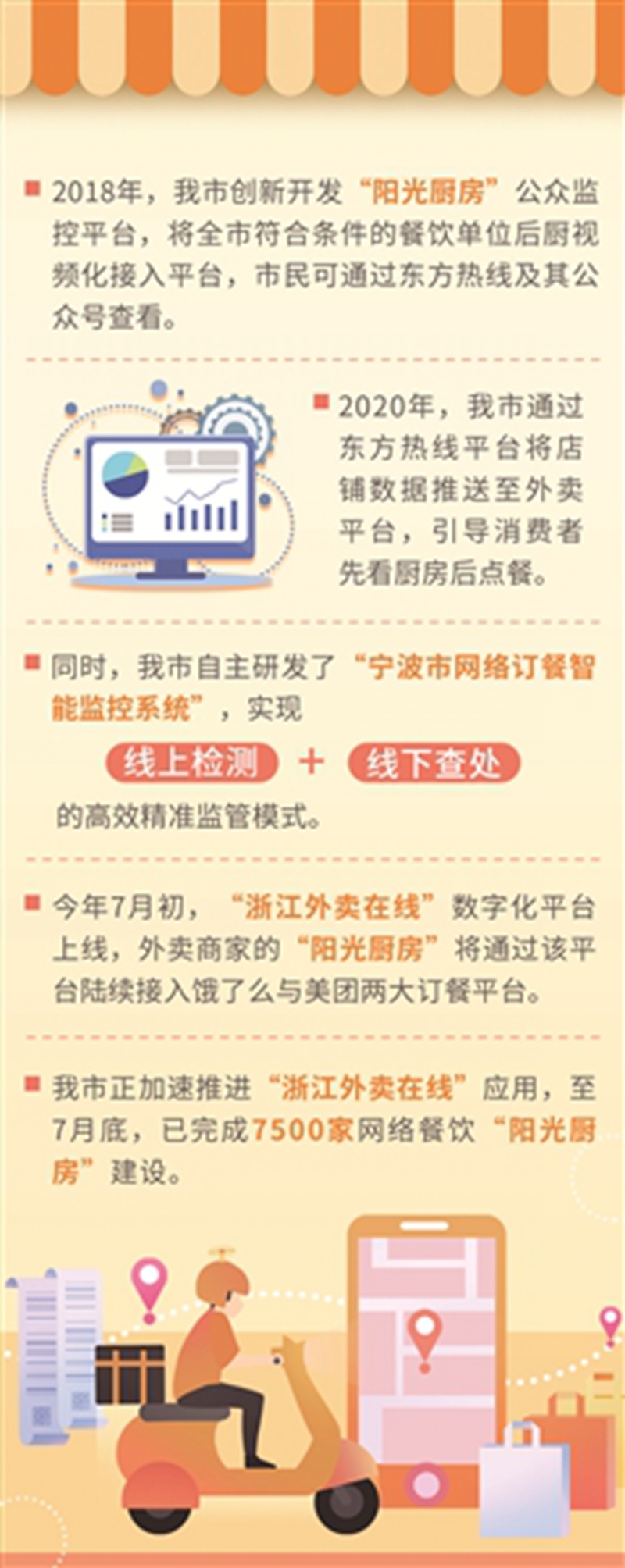 在浙江,从事网络餐饮服务的商家有20万余户,年交易额达500亿元。目前,宁波接入饿了么与美团两大外卖平台的餐饮单位已超3万家。随着外卖行业体量的增大,外卖商家良莠不齐、食品安全风险集聚、骑手交通事故频发、用工权益难以保障等问题也频频发生。为保障食品消费安全,促进外卖行业健康有序发展,我省打造“浙江外卖在线”数字化平台,汇集监管、执法、维权、保障等七大应用场景,对外卖行业展开全方位监督管理。