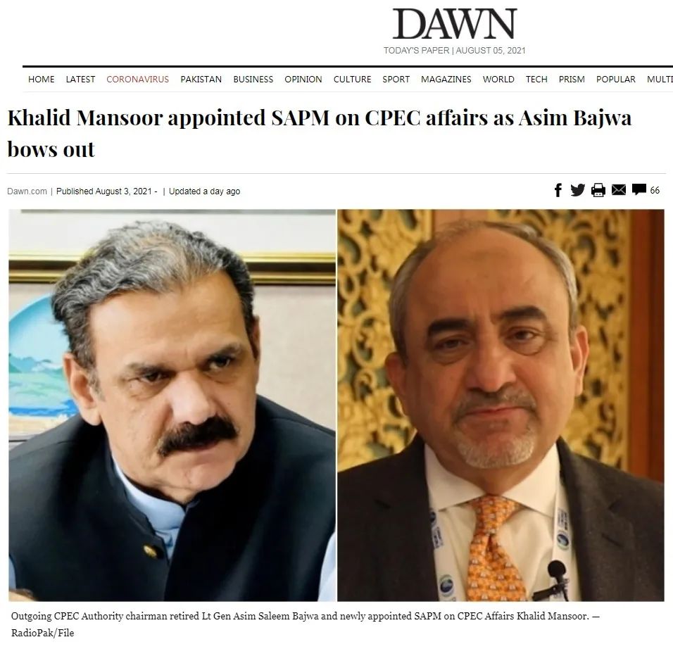 巴基斯坦规划、发展与特别项目部长奥马尔在推特上称赞了巴杰瓦在中巴经济走廊事务局的工作,并欢迎曼苏尔担任巴总理的中巴经济走廊事务特别助理。