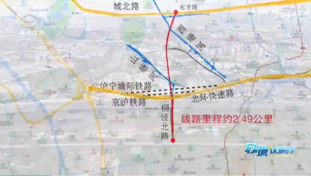 工程项目起点位于西塘河南岸,采用隧道形式下穿清塘路、山塘河、沪宁城际铁路、京沪铁路、北环快速路,在西园路口与现有的桐泾北路顺接,线路里程约2.07公里。