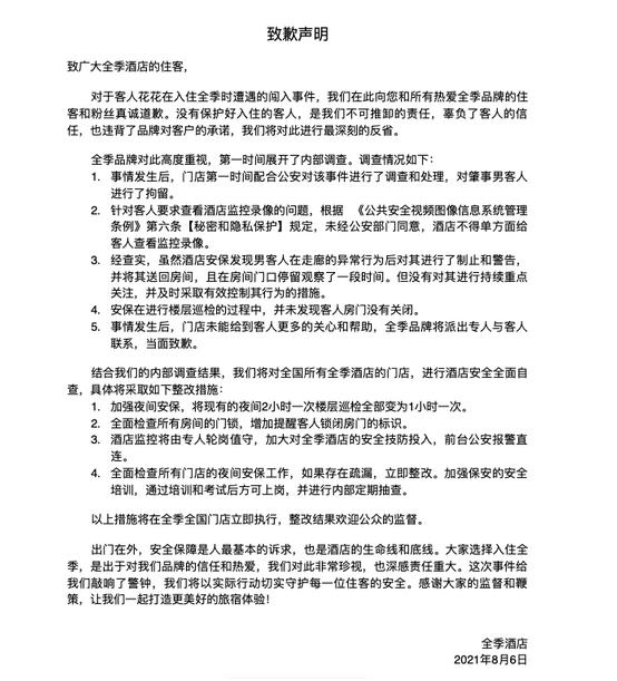 同时,声明表示,全国所有全季酒店的门面,将进行安全全面自查,采取多项整改措施,比如,将夜间2小时一次的楼层巡逻全部变为1小时一次。