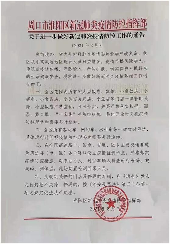 淮阳区要求,全区范围内所有的大型饭店、宾馆、小餐饮店、小超市、小食品店、小美容美发店、小旅店等门店一律暂时关停,小型饭店严禁堂食,只可外卖,并要严格落实扫码、测温、戴口罩、“一米线”等防控措施,具体开业时间视疫情防控形势和需要另行通知。