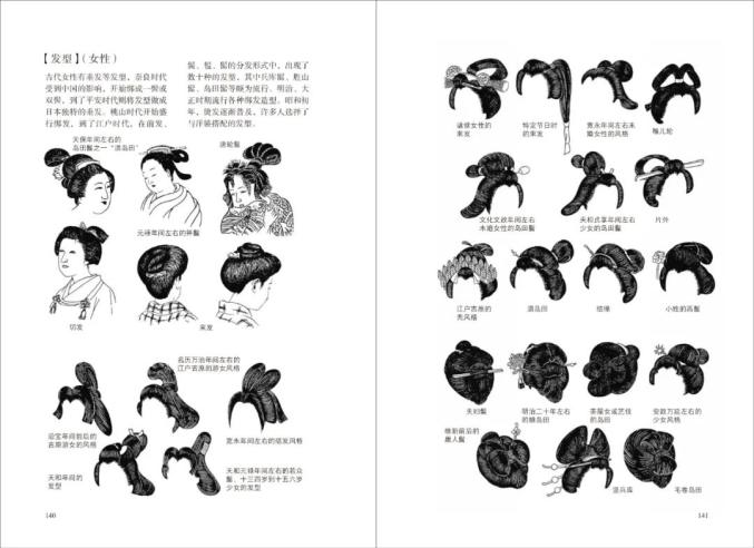 例如日本女性的发型,奈良时代受到中国影响诞生的一髻或双髻,到了平安时代将发型做成日本独特的垂发,桃山时代开始盛行的绑发,以及昭和初年逐渐普及的烫发等西式发型,一共为我们介绍了近90种日本女性发型,展现了各个时期具有代表性的女性发型。