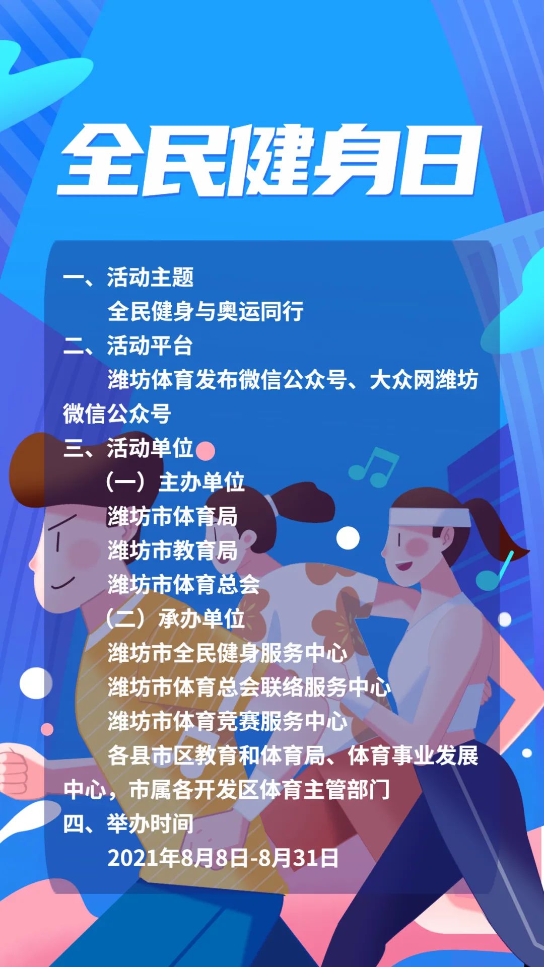 为纪念2008年北京奥运会的成功举办,经国务院批准,从2009年起,将每年的8月8日定为全国的全民健身日。设立全民健身日,是适应广大人民群众体育健身的需求,是进一步发挥体育的综合功能和社会效应,丰富社会体育文化生活,促进人的全面发展的需要,也是对北京奥运会的最好纪念。2021年8月8日,为庆祝全国第13个“全民健身日”,为出征东京的奥运健儿加油。在疫情防控常态化的情况下,潍坊市体育局、潍坊市教育局等部门联合向广大群众发出“加强全民体育锻炼,居家健身抗击疫情”倡议,并于8月8日-31日举办我市全民健身日线上系列活动。