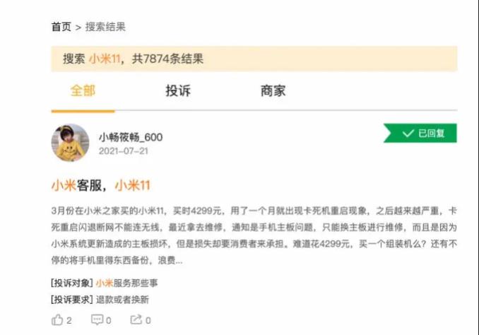 如网友“小畅筱畅_600”表示,其是在今年3月在小米之家入手的小米11,“用了一个月就出现卡死机重启现象,之后越来越严重,卡死重启闪退断网不能连无线,最近拿去维修,通知是手机主板问题,只能换主板进行维修。”
