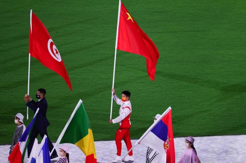 在东京奥运会闭幕式上,各代表团举着旗帜入场。手举五星红旗的,是中国田径梦之队的苏炳添。