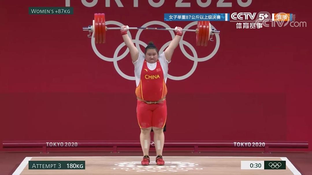 在举重女子87公斤以上级决赛中,出生于2000年的辽宁姑娘李雯雯,抓举140公斤,挺举180公斤。