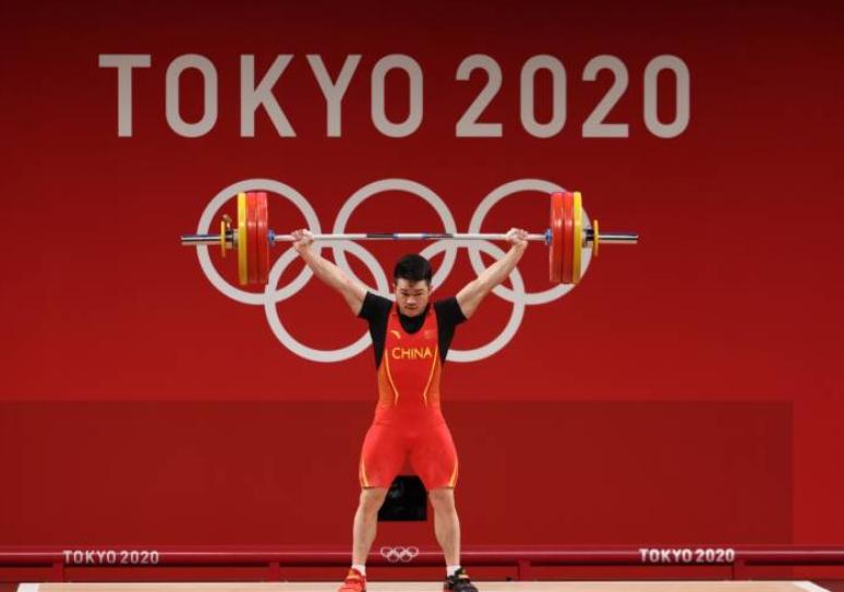 中国举重运动员,三朝奥运老将吕小军站立,下蹲,发力……以抓举170公斤,挺举204公斤,总成绩374公斤,夺得东京奥运会举重男子81公斤级冠军,三项成绩均创造了该项目的奥运会纪录