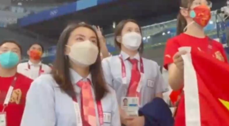 施廷懋和王涵在女子双人3米板上夺金。在夺冠后的升国旗奏国歌的环节,跳水皇后郭晶晶在看台和大家齐唱国歌。