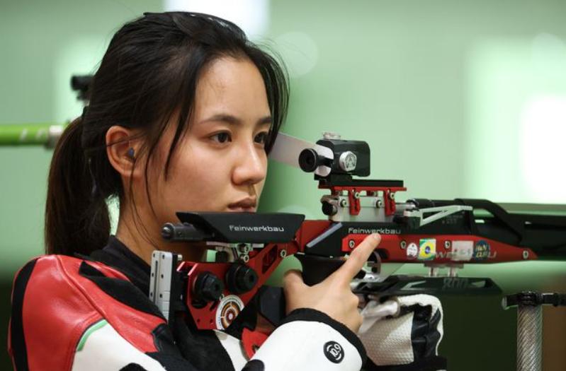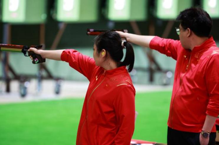 在射击混合团体10米气手枪的比赛中,庞伟携00后姜冉馨夺得冠军。