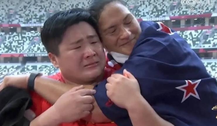 新西兰选手、铜牌获得者亚当斯第一个冲上去拥抱巩立姣,祝贺她圆梦成功。