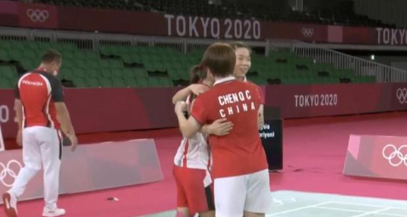 中国羽毛球选手陈清晨和贾一凡获得亚军。她们一起走上前,把印尼选手扶起来,拥抱祝福她们。
