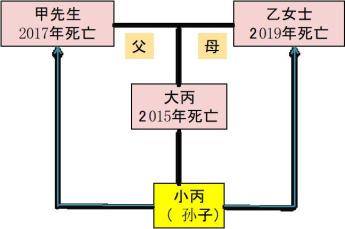 我们举个例子:甲先生与乙女士有一个儿子叫大丙,大丙有一个儿子叫小丙,2015年大丙先于父母甲、乙死亡,2017年甲先生死亡,2019年乙女士死亡,二人均未留有遗嘱。