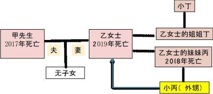 我们举个例子:假设在该案中,甲先生与乙女士婚后无子女,2017年甲先生死亡,2019年乙女士死亡,二人均未留有遗嘱。另外,乙女士有一个妹妹丙已于2018年死亡,丙有一个儿子叫小丙;乙女士有一个姐姐丁健在,丁有一个儿子叫小丁。