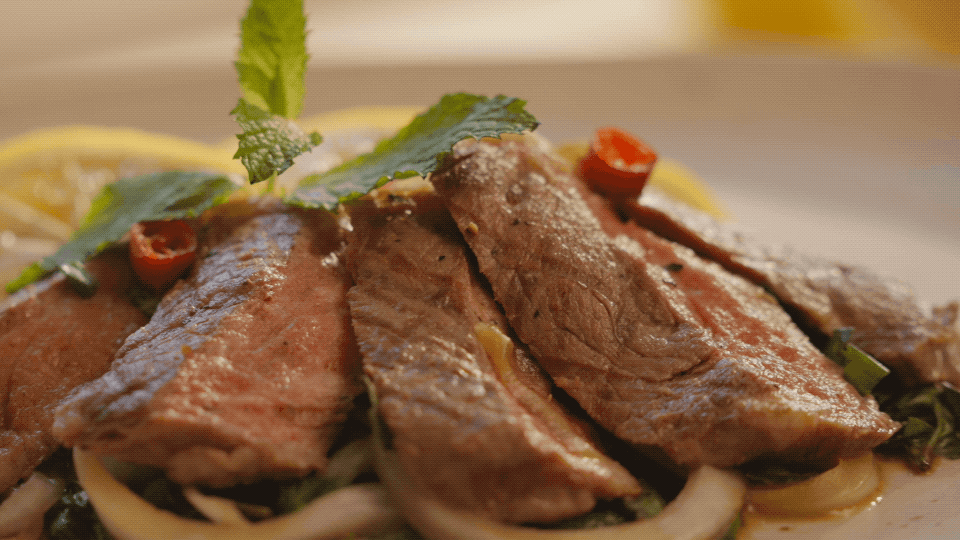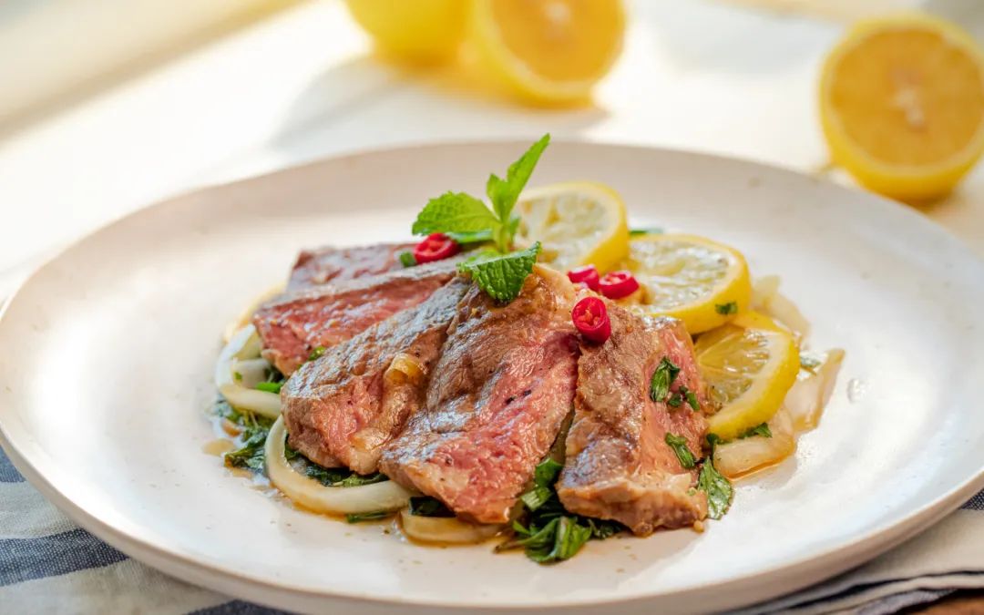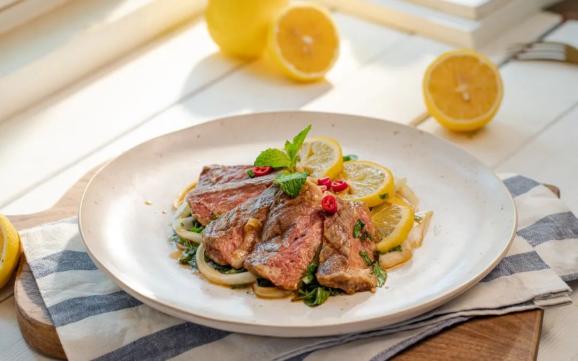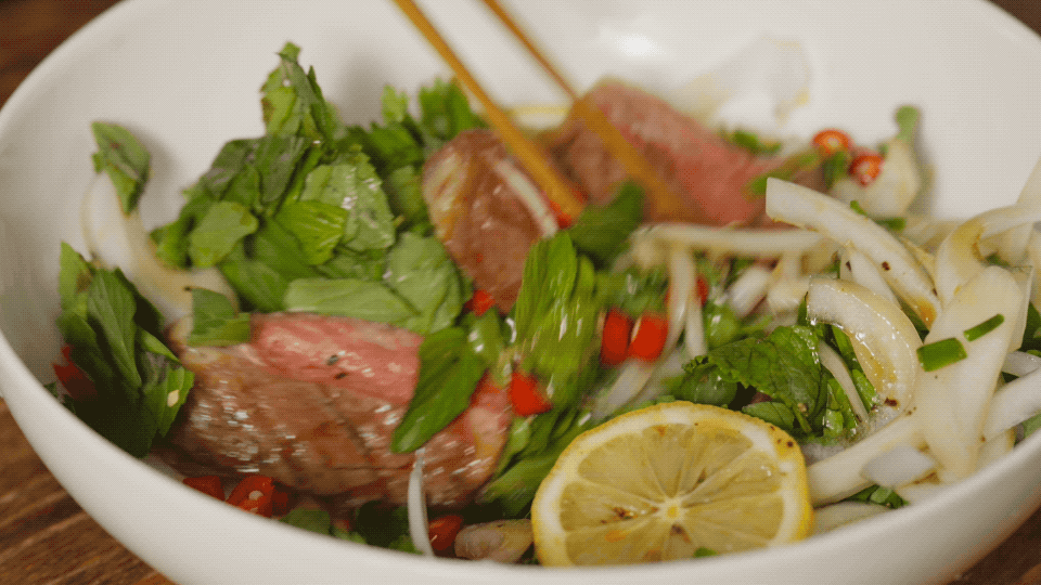 牛排肉、洋葱、香菜、薄荷、小米椒、柠檬片与料汁搅拌均匀,这道酸辣清爽的凉拌牛排就做好了。