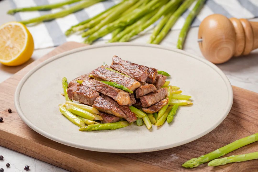 眼肉牛排200克、芦笋150克、黑胡椒、盐适量