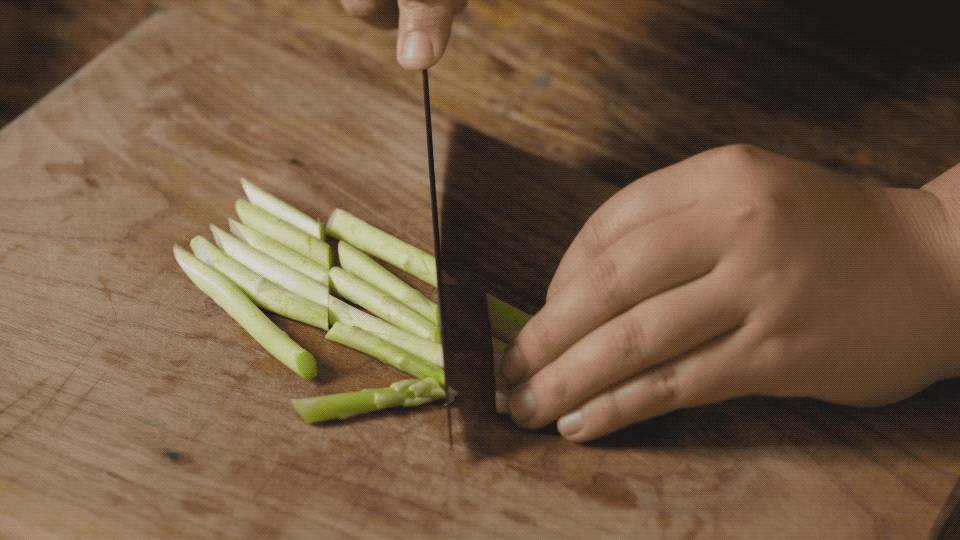 我们用它搭配芦笋,清爽简单,缓解吃肉的油腻感。芦笋切成段(如果芦笋太老需要削皮),锅中烧开水加3克盐,汆烫1分钟断生。