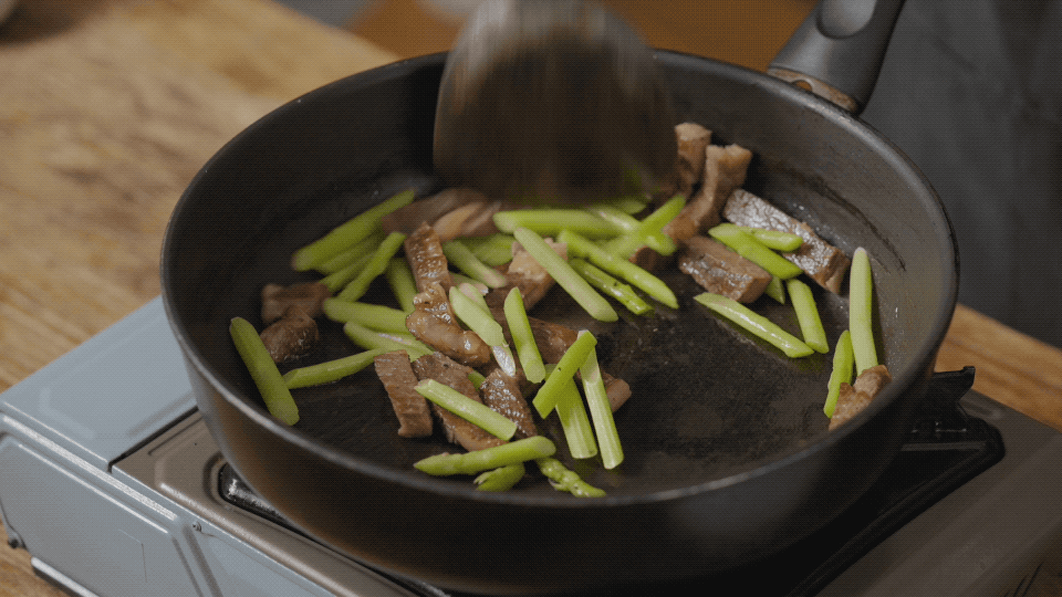锅中倒油,将牛排肉倒入锅中略微翻炒(不要翻炒太久,太久牛肉就老啦),倒入芦笋继续翻炒,锅中加少许盐、黑胡椒翻版均匀就能完成了。