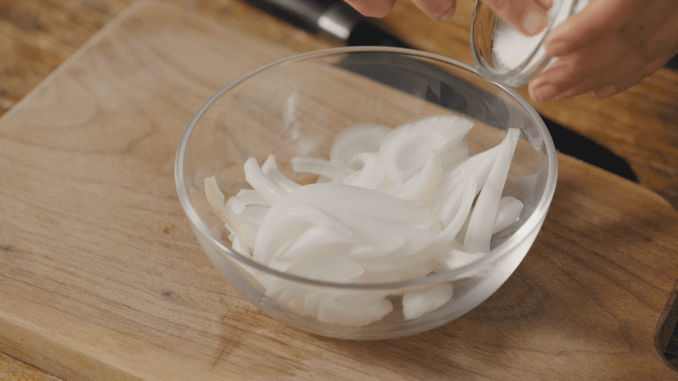 黄洋葱切丝,放1克盐腌制3分钟,倒出腌出的水。(这样可以去除洋葱里的辣味)