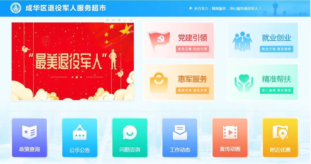 老班长了解到,为打通服务退役军人的“最后一公里”,成都市成华区按照“线上+线下”并行,互联网+实地站点同步的思路,整合各类资源,借助各类企事业单位和社会力量,试点打造退役军人“服务超市”。