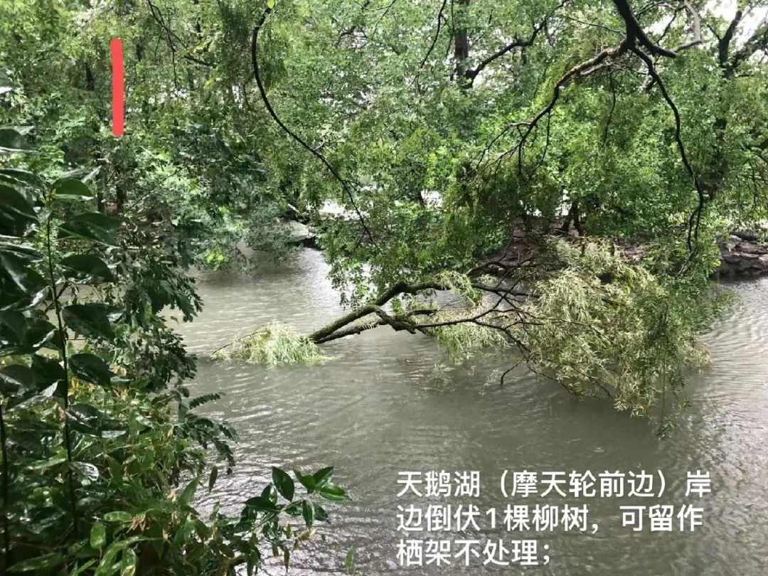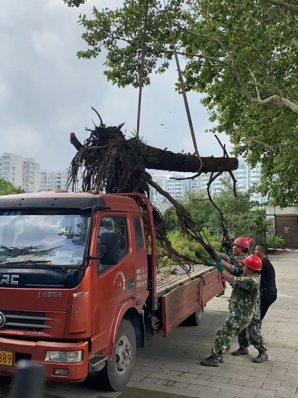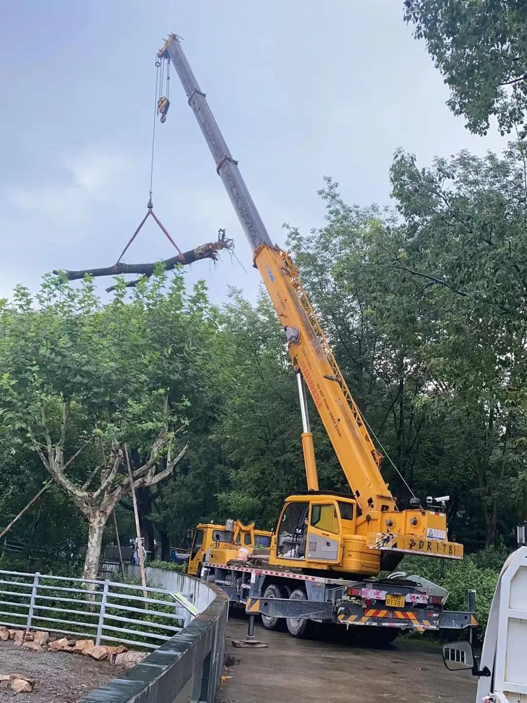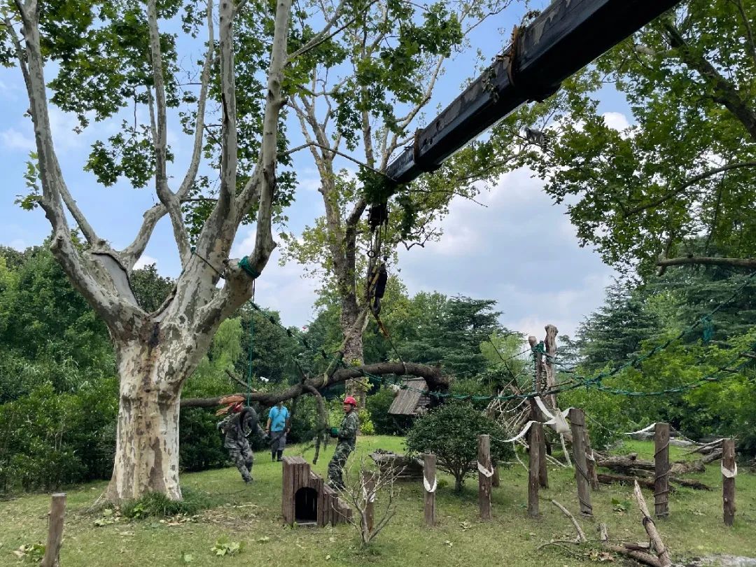 而对于无法修复的整棵大树,就需要绿化养护工作者将倒伏树木的断枝修剪平整,去除尖端,防止刺伤动物,然后适当去除部分枝杈,初步调整形状,随后吊车起吊,运送至需要的动物展区。