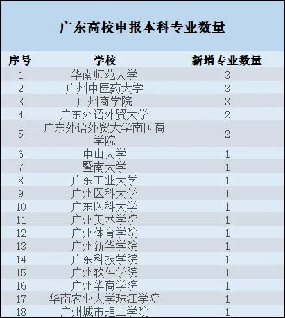 广东18所本科高校拟申报新增26个专业,其中华南师范大学、广州中医药大学、广州商学院各3个,广东外语外贸大学、广东外语外贸大学南国商学院各2个。