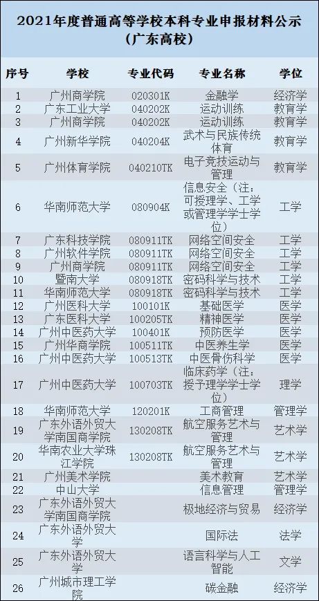 今年中山大学申请设立信息管理新专业;广东外语外贸大学申请设立国际法和语言科学与人工智能2个新专业;广州美术学院申请设立美术教育新专业;广州城市理工学院申请设立碳金融新专业;广东外语外贸大学南国商学院申请设立极地经济与贸易新专业。